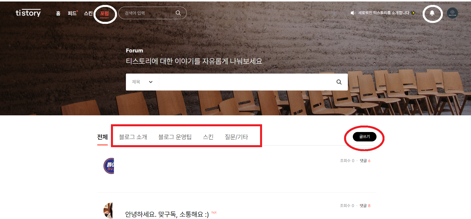 다음으로 유입을 조금이라도 늘리기 위한 초보자용 팁인데요. 왼쪽 상단의 붉은 동그라미 표시의 '포럼'으로 이동합니다. 다음 화면을 보실 수 있습니다.