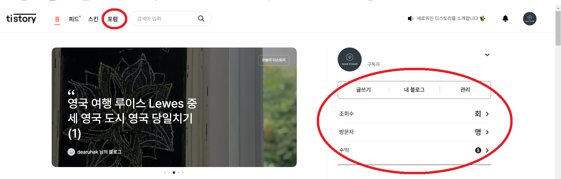 티스토리 홈페이지를 보면 초보자에게 유용한 정보가 있습니다. 구글에서 티스토리를 검색하여 티스토리 메인화면으로 이동 및 로그인 하면, 아래 메인 화면의 우측에 내 블로그의 조회수 등 현황을 알 수 있고, 내 블로그로 이동하여 바로 글쓰기, 관리 등이 가능합니다.