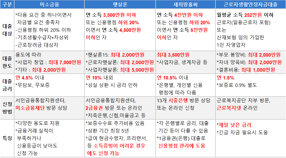 1. 미소금융 : 상품 종류별 대출 대상, 한도, 금리, 신청 방법 및 특징