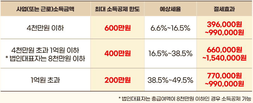 2025년부터는 소득공제 한도가 확대되어, 가입자의 절세 혜택이 더욱 커집니다. 사업(근로)소득 4천만원 이하는 600만 원까지, 4천만 원 초과 1억 원 이하는 400만 원까지 소득공제 한도가 올라갑니다. 또한 법인대표자의 소득공제 기준도 완화되어, 총급여 8천만원 이하까지 가입이 가능합니다.