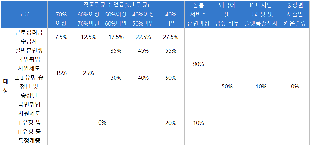 * 특정 계층 : 고용위기지역 및 특별고용지원 업종 대상자, 출소예정자, 장애인, 기초생활수급자 및 차상위계층, 자립준비 청년('아동복지법'에 따른 보호 종료 아동 중 34세 이하자), 한부모가족 해당자, 북한이탈주민, 아프간 특별기여자, '가사근로자의 고용개선 등에 관한 법률'에 따른 가사 근로자('23. 7. 1.부터 '25. 1. 1. 이전에 시작된 훈련 과정에 한함)