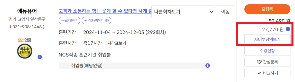 - 우측 '자비 부담액 보기'를 클릭 후 개인별 조건(특정 계층 여부, 국민 취업제도 유형 등)을 체크하면 확인 가능
