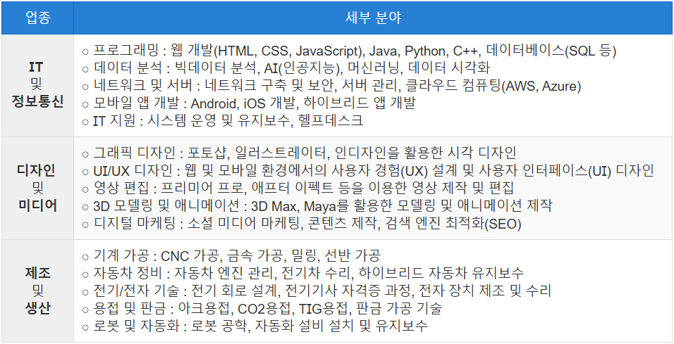 (1) IT·정보통신, 디자인·미디어, 제조·생산 : 프로그래밍, 그래픽 디자인, 전기차 수리 등