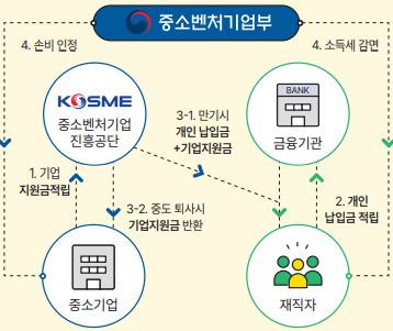 - 기업 지원금은 만기 해지 시에 해당 저축 공제금 수령 계좌로 입금됩니다. 단, 중도 해지 시에는 사유에 따라 중소벤처기업진흥공단의 심사를 통해 기업지원금이 지급될 수 있습니다.