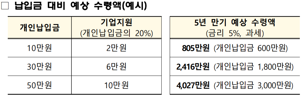 - 근로자(저축 가입자)가 매월 납입한 금액의 20%를 기업에서 지원해 드립니다. 가입자가 매월 50만 원씩, 5년간 적립(총 3000만 원)한다면, 기업 지원금으로 600만 원을 받을 수 있습니다.