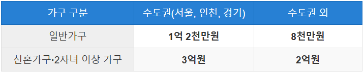 - 일반가구 : 수도권 3억원, 수도권외 2억원