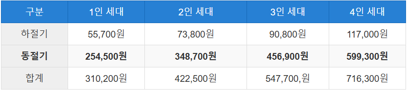 * 세대원 수(주민등록 등본 기준)를 고려하여 세대당 금액을 차등 지급되며, 수급자의 소득 산정에 반영되지 않습니다.
