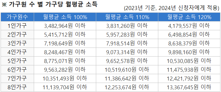 [해당 세대 소득 기준] * 가구원 수 1명 - 120%, 2명 - 110% 이하, 3명 이상 - 100% 이하 |