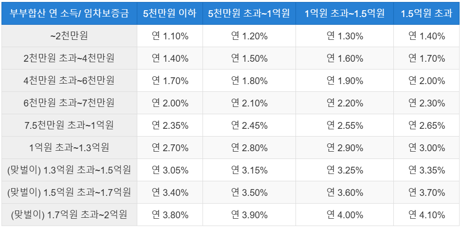 - 대출 신청 시 산정된 부부합산 연소득 수준에 따라 아래의 금리 적용